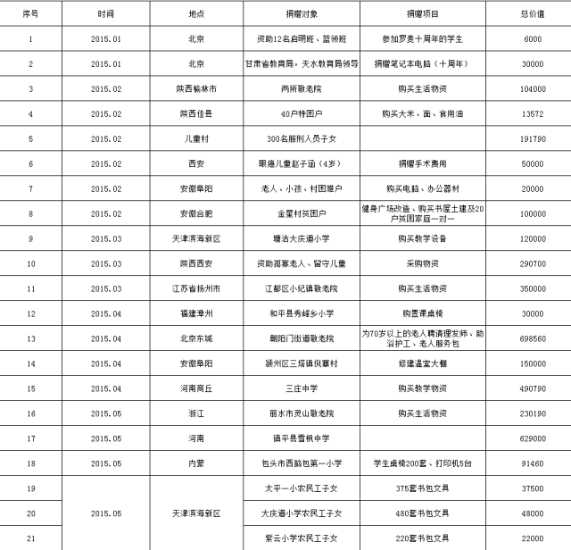 2015年年度捐贈明細——捐贈金額、受助人(單位)公示